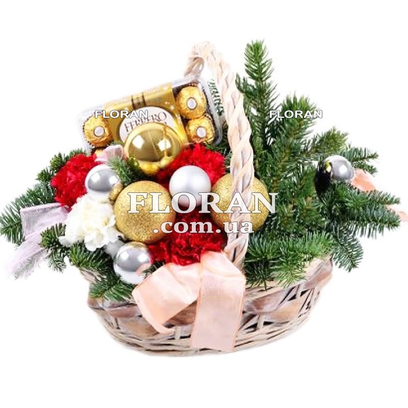 5 красных и белых гвоздик, 7 елочных шаров, конфеты Ferrero rocher 200 г, ветки ели или сосны, корзина