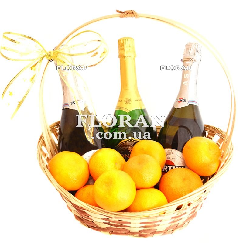Новогодняя корзина с шампанским - код товара FL-605. Корзина с шампанским и мандаринами - идеальный подарок для тех, кто ценит изысканный вкус и красивое оформление. Сочетание свежих, сладких мандаринов и изысканного искристого шампанского Martini Asti и Asti Mondoro, создаст атмосферу праздника и подарит незабываемые эмоции.