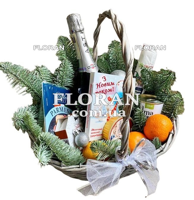 коробка конфет Любимов 125 г или другие конфеты, сыр твердый – 1 шт., сыр мягкий 100-130 г – 1 шт., сыр мягкий фета или фелата - 1 шт., оливки – 1 шт., маслины – 1 шт., колбаса сыроватая 80 г, апельсин 3 шт., шампанское Martini Asti (в подарок), 3 новогодние игрушки, ветви ели или сосны (в период с 6.12 по 31.12)