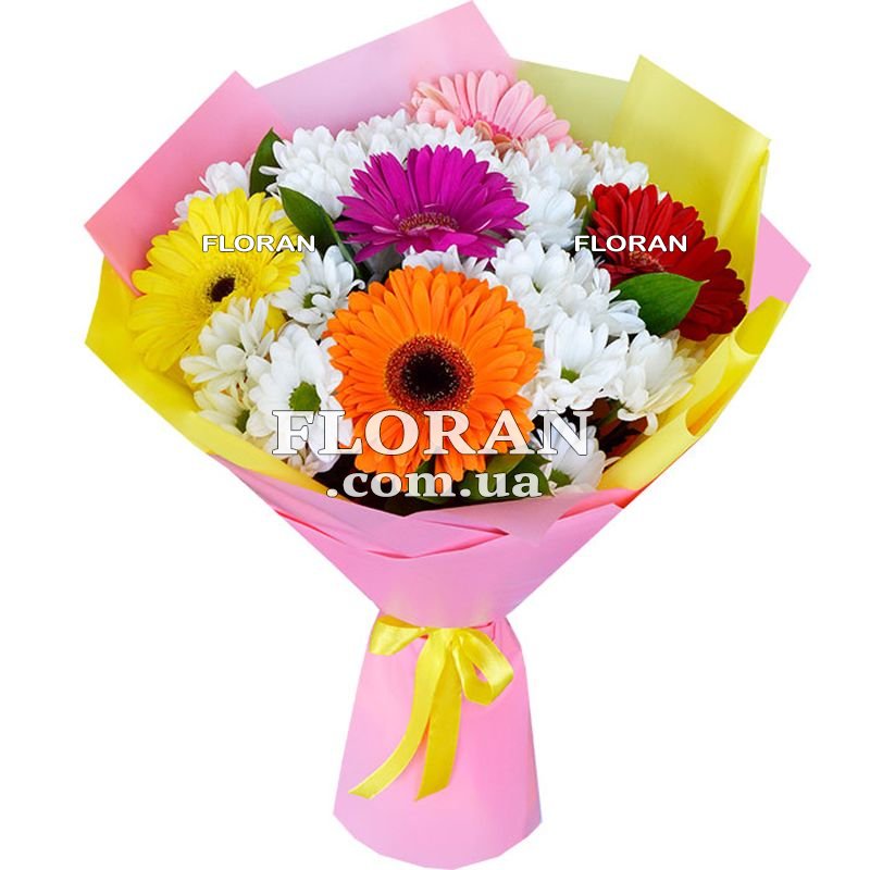 5 разноцветных гербер, 6 белых хризантем, упаковка