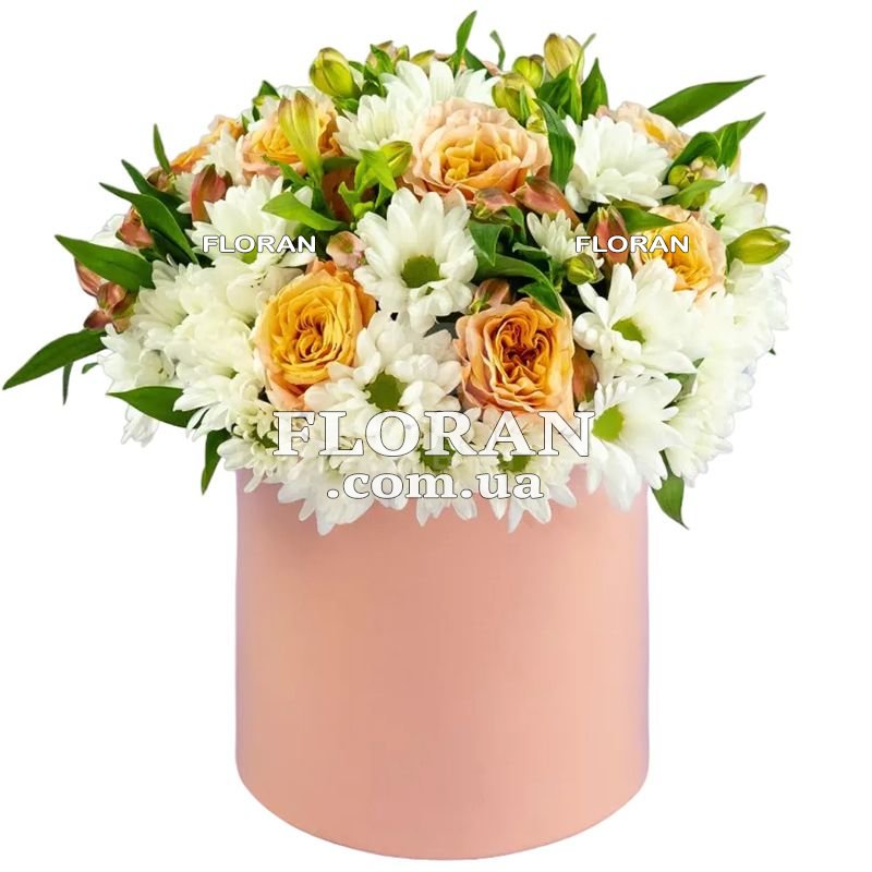 11 роз Мисс Пигги, 7 желтых альстромерий, 7 белых хризантем, коробка