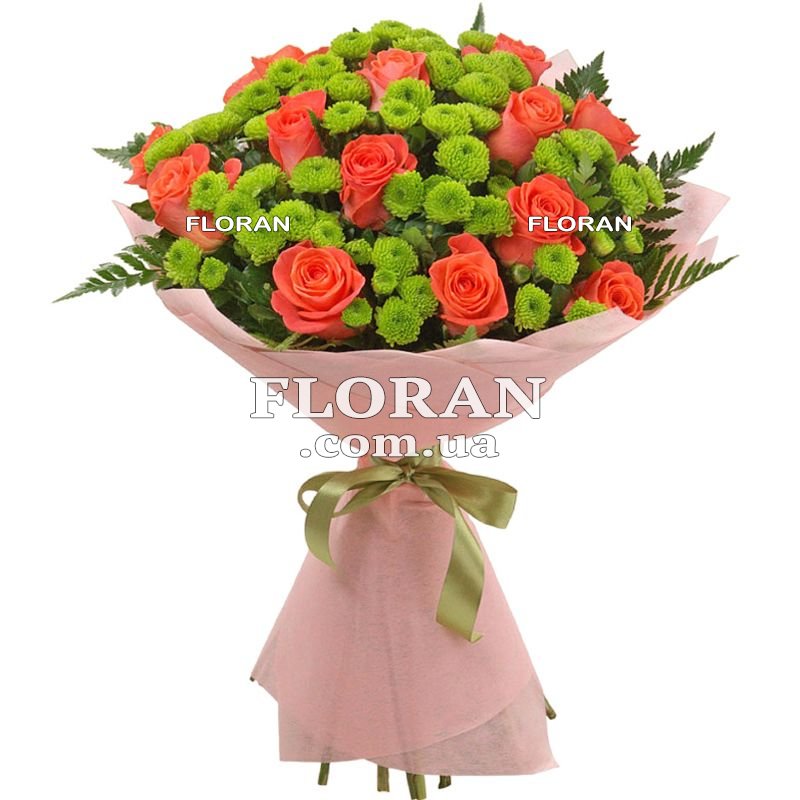 15 оранжевых роз, 18 зеленых хризантем, упаковка