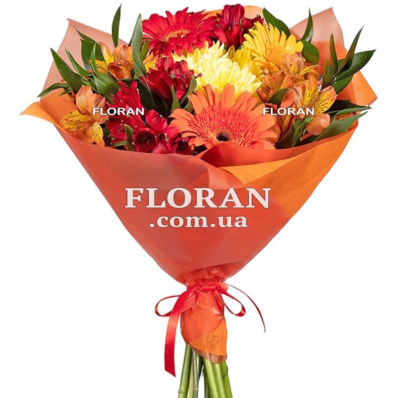 Осенний букетик - код товару FL-1372 - это яркая и насыщенная композиция, которая олицетворяет красоту и тепло осени. В этом букете вы найдете 3 герберы, которые своими яркими лепестками напоминают о пышности и разнообразии осенней природы. Дополнительно в букете присутствуют 4 красные и оранжевые альстромерии, которые символизируют энергию и страсть. Их сочные цвета привносят ощущение тепла и уюта в осенний букетик. Чтобы добавить нотку солнечного света и яркости, в композицию включены 2 желтые хризантемы. Эти цветы символизируют радость и оптимизм, придавая букетику дополнительную энергию. Упаковка букетика выполнена с заботой и вниманием, чтобы сохранить свежесть и красоту цветов. Осенний букетик станет прекрасным подарком на осенние праздники, как символ благодарности и радости. Его насыщенные цвета и уникальная комбинация цветов привлекут внимание и создадут теплую атмосферу осени.