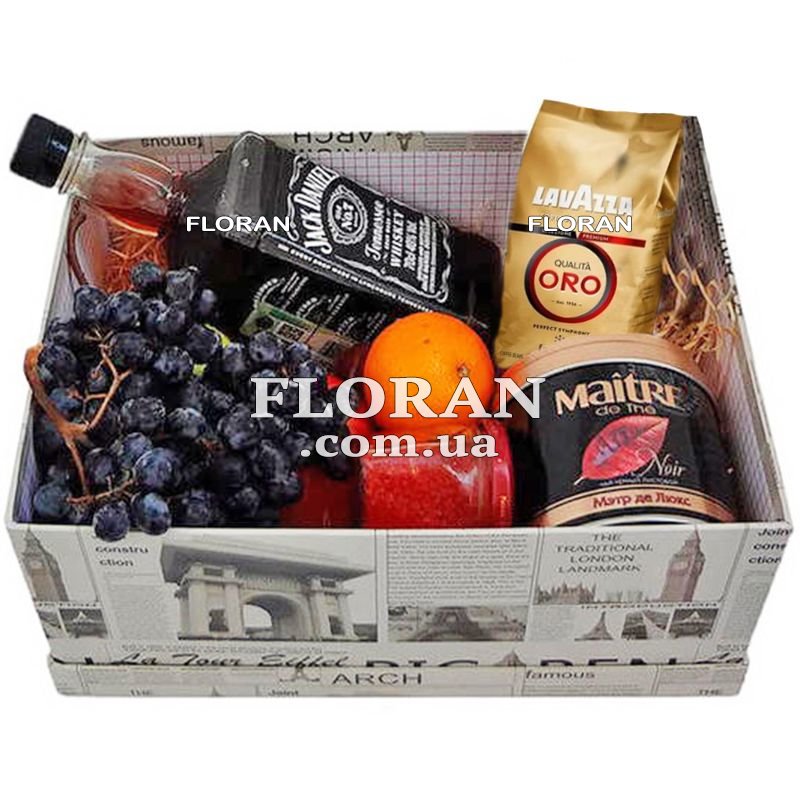 чай черный – 1 шт., кофе молотый 240-250 г - 1 шт., икра лососевая в жестяной банке – 1 шт., виноград, яблоки – 2 шт., лимон – 1 шт., апельсин 2 шт., виски Jack Daniel`s 0.5 л (в подарок)
