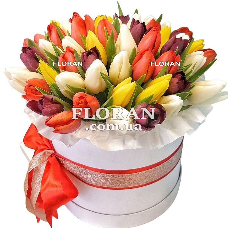 Подарочная коробка тюльпанов - код товара FL-2875 - это воплощение яркости и разнообразия в одном прекрасном композиционном решении. Этот великолепный букет тюльпанов несет в себе не только красоту цветов, но и символизирует разнообразие чувств и эмоций. 53 тюльпана в различных оттенках создают удивительное сочетание цветов и форм, наполняя комнату свежестью и ароматом весны. Такой подарок станет настоящим проявлением вашего восхищения и заботы. Эта яркая композиция идеально подходит для любого торжественного случая — от дней рождения до юбилеев и специальных моментов. Также она отлично подчеркнет вашу заботу и внимание к человеку, которому предназначен этот букет. Наша команда курьеров готова обеспечить оперативную доставку этого потрясающего подарка в указанное вами место. Таким образом, вы можете легко создать момент счастья и удивления для вашего близкого человека, делая этот день особенным.
