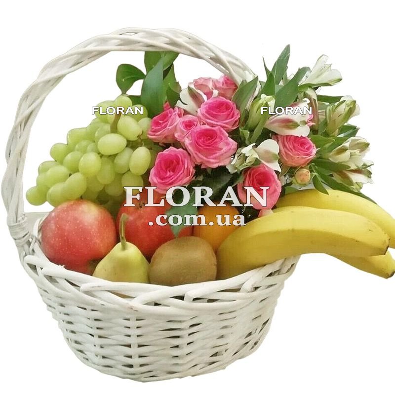 Подарочная корзина с фруктами и цветами - код товара FL-1992. Забудьте о бесконечных походах по магазинам и мучительных раздумьях в поисках подходящего подарка. С интернет-магазином Floran.com.ua все гораздо проще! Хотите удивить и порадовать близкого человека? Обратите внимание на наши корзины с фруктами и цветами. На сайте представлены композиции на любой вкус, каждая из которых собрана с любовью и профессионализмом. Подарочная корзина с фруктами и цветами - это нежное и вкусное сочетание, которое создаст атмосферу радости и тепла. Независимо от повода, такой подарок будет весьма кстати. Внутри этой уникальной композиции вы найдете апельсины, яблоки, груши, киви, бананы и виноград, представляющие собой букет витаминов и свежести.Но это еще не все! Дополнительным волшебством станут цветы, которые добавят нотку элегантности и красоты. В этой корзине прекрасно гармонируют 3 альстромерии и 2 кустовые розы, создавая романтичное и нежное сочетание цветов и ароматов. Этот подарок подходит для разнообразных событий - от дней рождения до юбилеев, от романтических встреч до праздников в кругу семьи. Он выражает заботу и внимание, позволяя вам подарить не только вкусные фрукты, но и красоту цветов. Эта корзина станет идеальным способом пожелать счастья и радости близким людям.