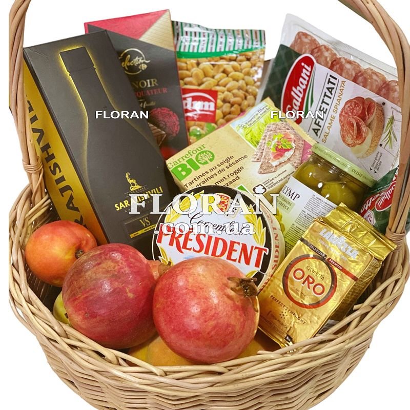 коньяк украинский 0.5 л (в подарок), кофе молотый 240-250 г - 1 шт., нарезка бекона, грудинки, балыка или ветчины – 2 шт., колбаски в вакуумной упаковке или палка колбасы – 1 шт., сыр мягкий 100-130 г – 1 шт., хлебцы 70-100 г – 1 шт., оливки – 1 шт., арахис жареный 130-180 г, плитка шоколада – 1 шт., яблоки – 5 шт., апельсин 2 шт., гранат или другой сезонный фрукт – 2 шт.
