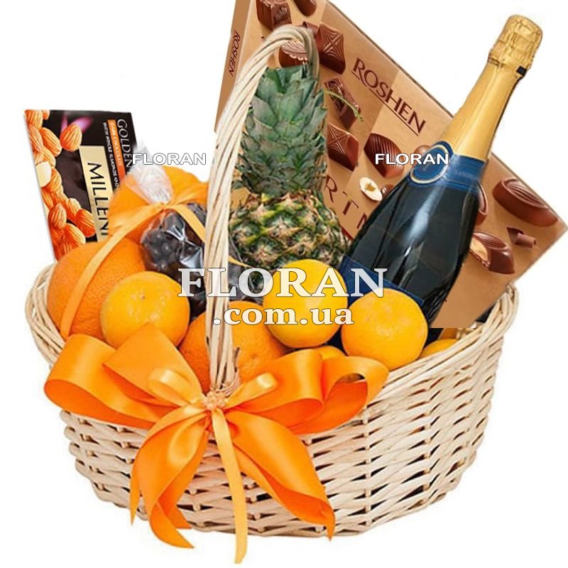 1 ананас, апельсины, мандарины, коробка конфет 140-150 г, плитка шоколада – 1 шт., драже M&M's или Skittles 90 г, шампанское украинское (в подарок), ветви ели или сосны (в период с 6.12 по 31.12)