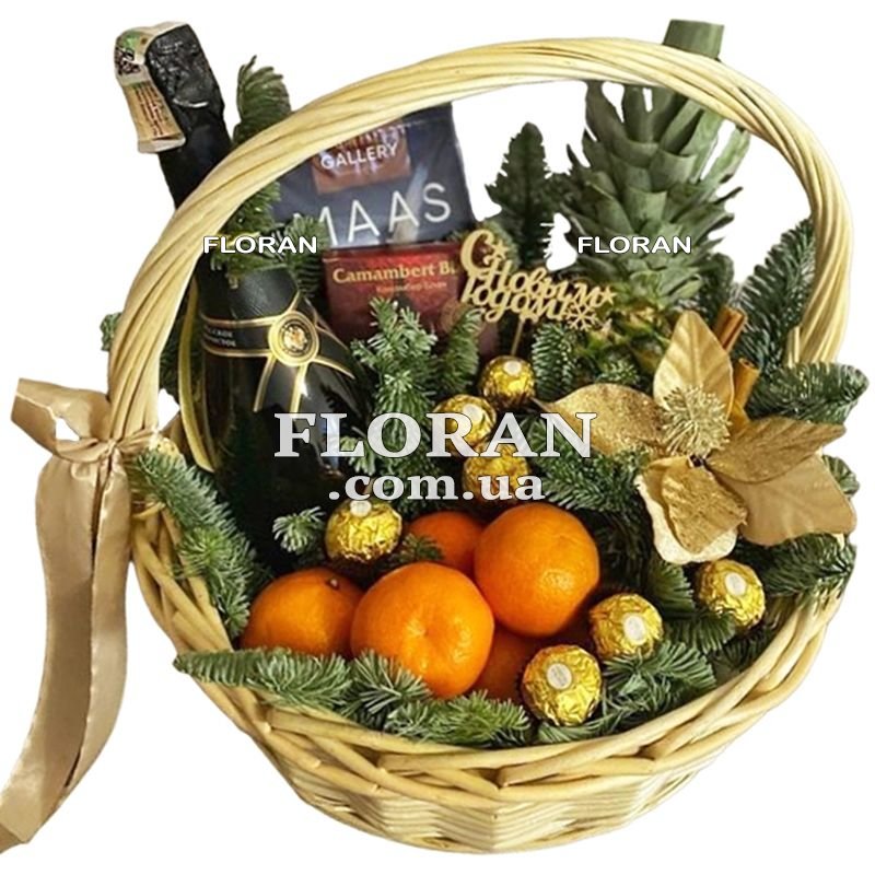 конфеты Ferrero Rocher 200 г, 1 ананас, мандарины, сыр мягкий 100-130 г – 1 шт., сырная нарезка 140-180 г – 1 шт., сыр твердый – 1 шт., шампанское украинское (в подарок), ветви ели или сосны (в период с 6.12 по 31.12)