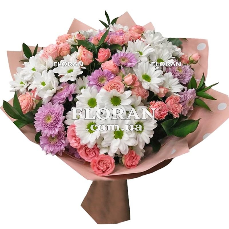 Поздравительный букет цветов - код товару FL-1373 - это прекрасный выбор для выражения поздравлений и наилучших пожеланий. В его состав входят 9 розовых кустовых роз, которые символизируют нежность, любовь и признание. Эти розы порадуют и восхитят своей красотой и ароматом, создавая атмосферу теплоты и радости. Дополнительно в букете присутствуют 10 белых и розовых хризантем, которые придают композиции изысканность и изящество. Хризантемы являются символом долголетия, процветания и доброго пожелания. Их мягкие лепестки и яркие цвета добавят свежести и жизнерадостности поздравительному букету. Упаковка букета выполнена с заботой и вниманием, чтобы подчеркнуть его красоту и сохранить свежесть цветов. Поздравительный букет цветов станет прекрасным подарком на любой праздник или особый день, передавая самые теплые и искренние пожелания. Его яркие цвета и элегантная композиция подчеркнут значимость момента и наполнят его особенной атмосферой радости и восхищения.