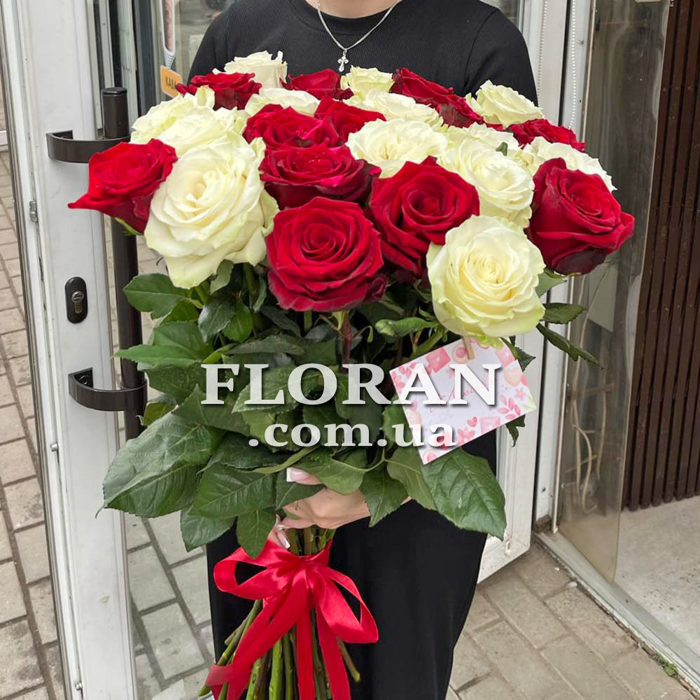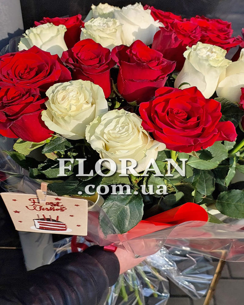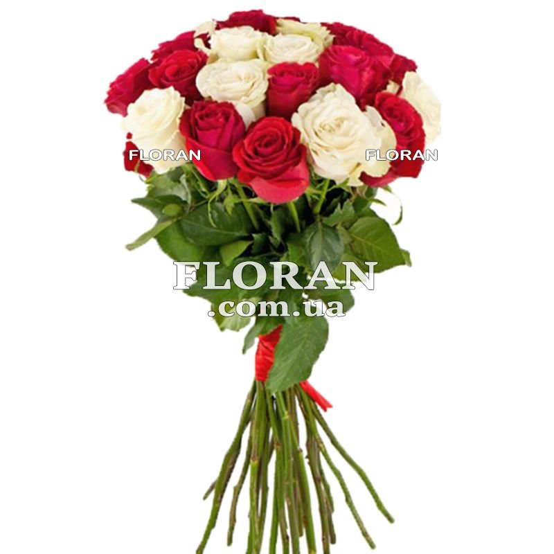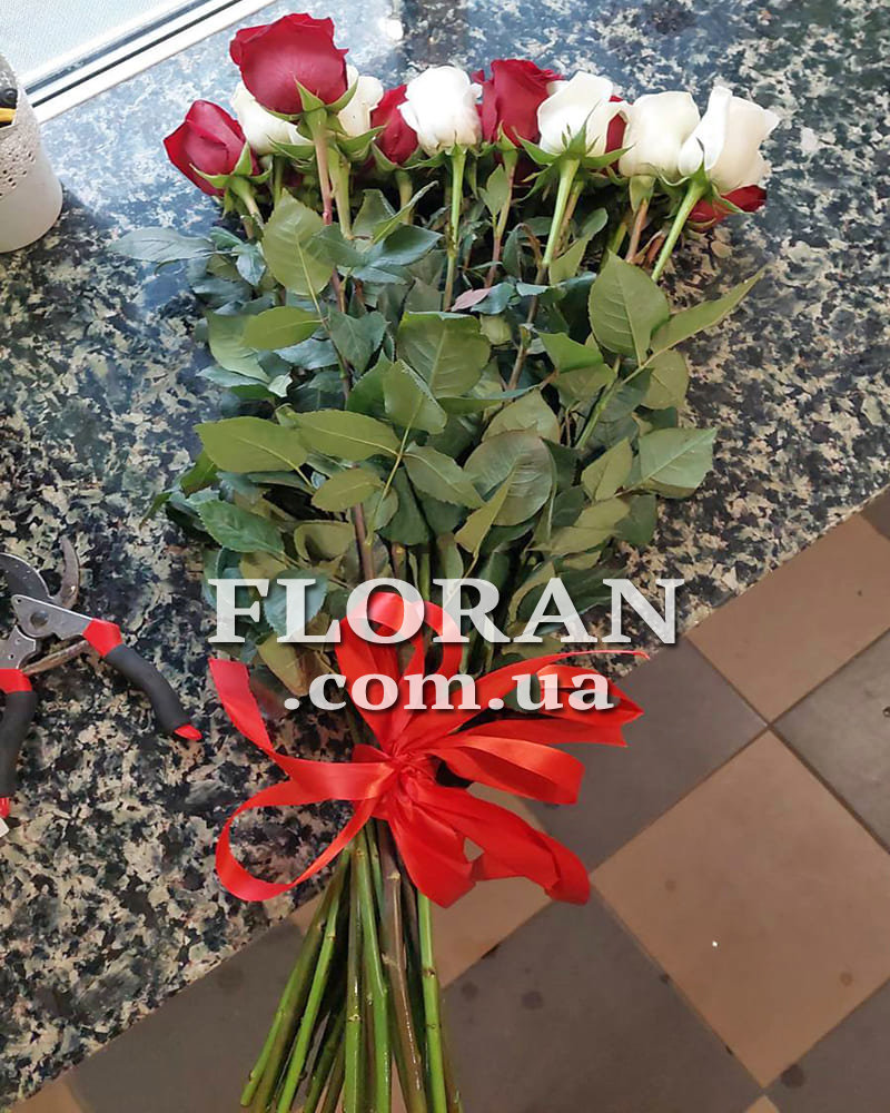 21 красная и белая импортная роза, лента или упаковка