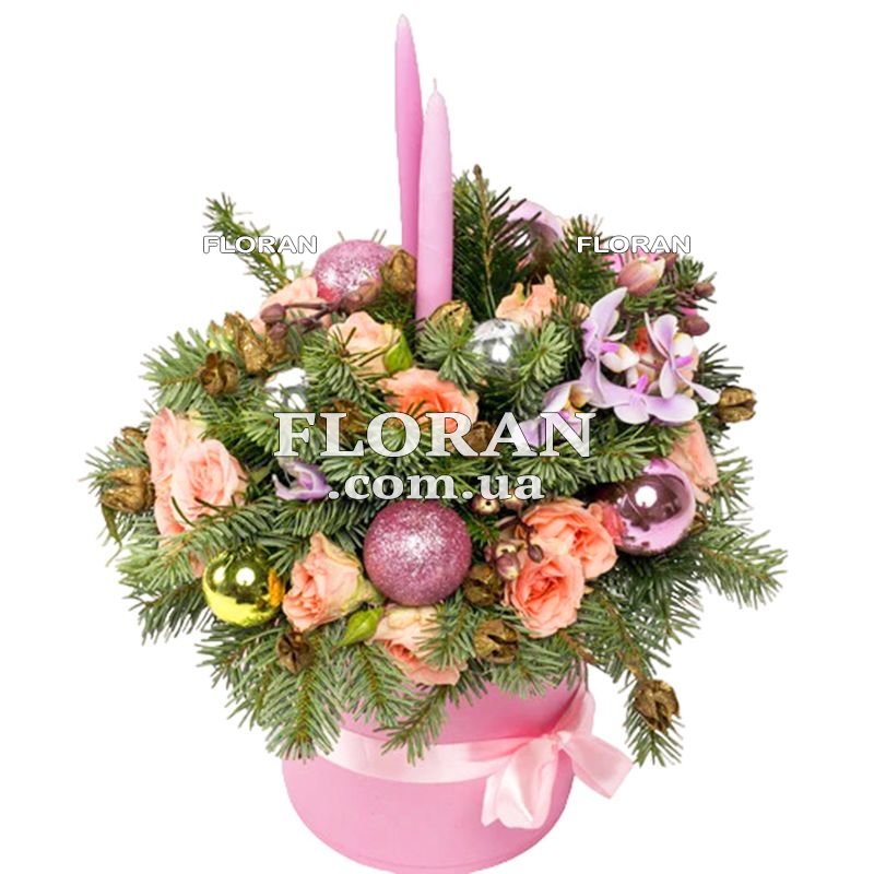 1 ветка орхидеи фаленопсис, 8 розовых кустовых роз, 2 свечи, ветки ели или сосны, коробка