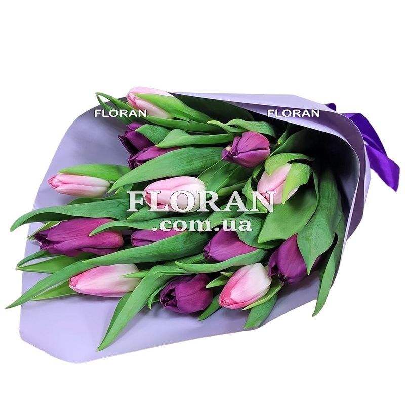 Розовые и фиолетовые тюльпаны - код товара FL-2417/ Букет, состоящий из 15 розовых и фиолетовых тюльпанов, представляет собой комбинацию нежных и романтичных цветов. Розовые тюльпаны обычно ассоциируются с нежностью, любовью и благодарностью. Фиолетовые тюльпаны, в свою очередь, могут символизировать загадочность и волшебство. Такой букет может быть замечательным подарком для особых моментов в жизни, когда вы хотите выразить свои чувства. Упаковка букета обеспечивает его сохранность и придает ему завершенный и красивый вид. Розовые и фиолетовые тюльпаны создадут атмосферу нежности и загадочности, что делает этот букет подходящим для романтичных встреч, дня свадьбы, годовщины отношений и других особых событий. Такой букет может стать замечательным проявлением ваших чувств и заботы к близкому человеку, создавая атмосферу тепла и радости.