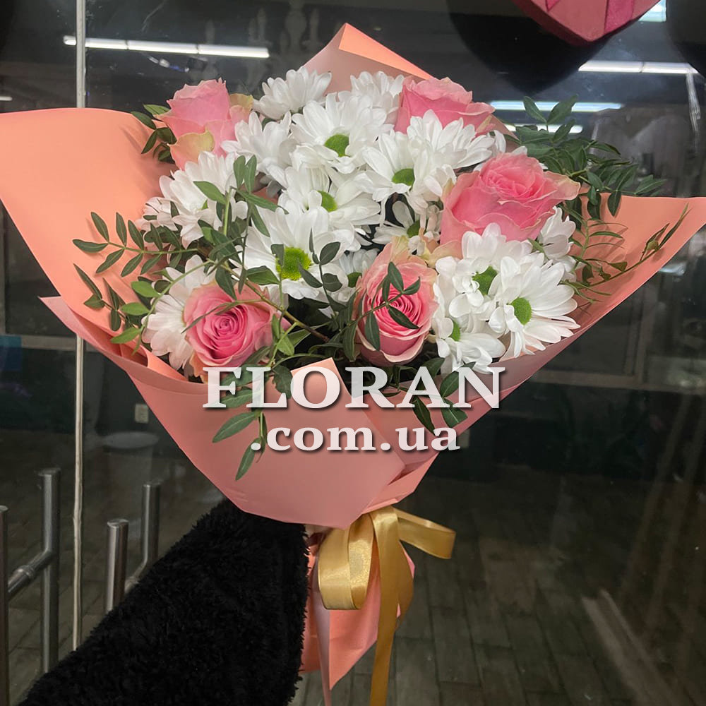 Розовые розы и хризантемы - код товару FL-1108. Букет из 5 розовых роз и 4 белых хризантем обладает нежной и романтической красотой. Розовые розы являются символом любви, нежности и красоты. Их оттенок приносит в букет нотки романтики и элегантности. Белые хризантемы, в свою очередь, придают букету свежий и чистый вид. Белый цвет символизирует чистоту, невинность и свет. Комбинация розовых роз и белых хризантем создает прекрасный контраст и гармонию в букете. Бархатные лепестки розовых роз великолепно сочетаются с пышностью и текстурой хризантем. Этот букет будет идеальным подарком для особых моментов в жизни, таких как юбилей, день рождения или романтическое свидание. Упаковка букета добавит завершенность и элегантность. Добавление ленты или упаковки дополнит образ букета и придаст ему особую изысканность.