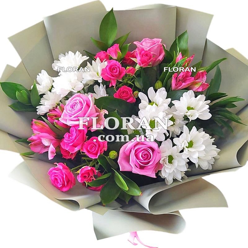 Сборный букет из живых - код товару FL-1369. Сборный букет из живых цветов включает в себя нежные и прекрасные цветы, которые создают гармоничное сочетание оттенков и форм. В нем присутствуют 3 розовые розы, приносящие чувство любви и нежности. Кроме того, в букете присутствуют 3 розовые кустовые розы, которые придают ему объем и элегантность. 3 розовые альстромерии добавляют свежести и изысканности. В композиции также присутствуют 2 белые хризантемы, которые придают букету легкость и чистоту. Хризантемы символизируют благополучие и долголетие, а их белый цвет ассоциируется с чистотой и невинностью. Зелень в букете добавляет свежести и природной красоты, создавая гармоничное сочетание с основными цветами. Упаковка букета защищает цветы и придает ему завершенный и презентабельный вид. Сборный букет из живых цветов является идеальным подарком для различных особых случаев и праздников. Он выражает чувства, передает пожелания и станет прекрасным символом любви, внимания и заботы. Получение такого букета будет радостным событием для любого получателя, и он сможет наслаждаться его красотой и ароматом в течение долгого времени.