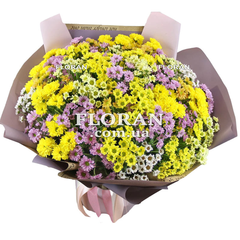 Шикарный букет хризантем - код товара FL-881. Шикарный букет хризантем, состоящий из 45 разноцветных цветов, поразит своим разнообразием и красотой. Этот букет идеально подойдет в качестве впечатляющего подарка на особые моменты в жизни или просто для того, чтобы сделать день особенным. В этом букете каждая хризантема имеет свой уникальный оттенок, создавая яркую палитру цветов. От нежных пастельных оттенков до ярких и насыщенных цветов, эти разноцветные хризантемы придают букету жизненную энергию и радость.
