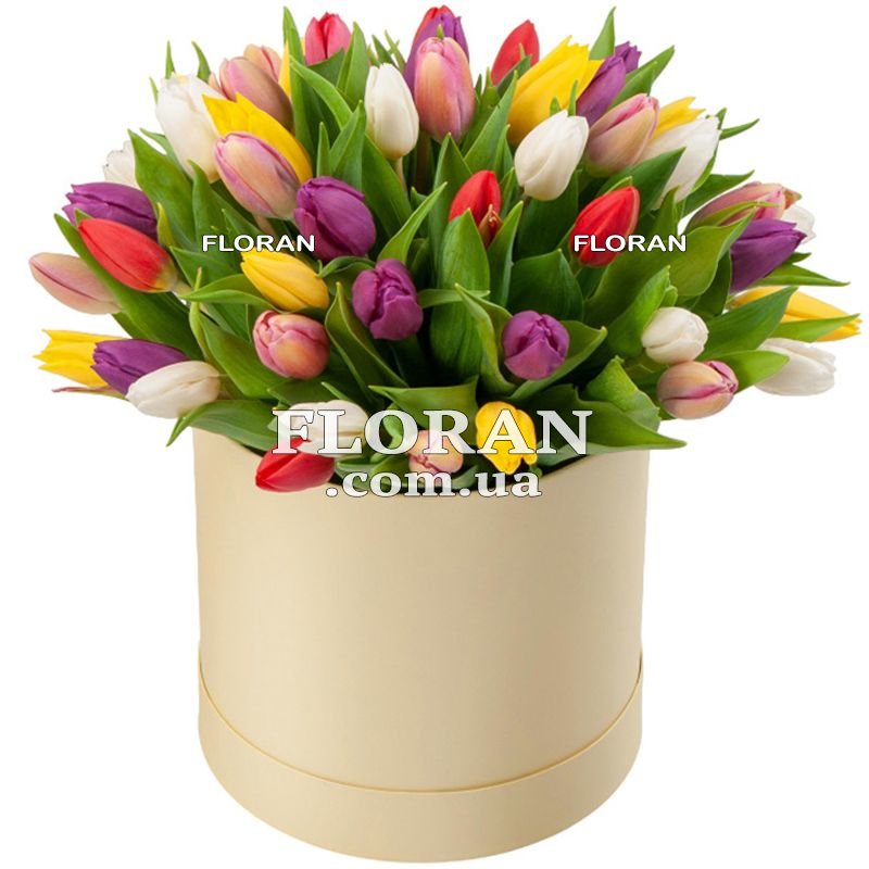 Тюльпаны в шляпной коробке для любимой - код товара FL-2855. Для самой любимой, которая достойна только лучшего, этот уникальный букет из 61 разноцветного тюльпана в шляпной коробке — настоящий символ вашей нежности и восхищения. Тюльпаны, разнообразно раскрывающие свои лепестки, символизируют свежесть, нежность и весеннюю радость. Их разноцветие подчеркивает богатство ваших чувств и желание сделать этот момент особенным. Шляпная коробка — это не только удобное и оригинальное упаковочное решение, но и некий акцент, который придает букету особую изысканность. Этот букет тюльпанов — не просто цветы, это произведение искусства, которое воплотит ваши чувства в визуальной красоте. Чтобы этот букет достиг своей цели, вам не нужно заботиться о доставке. Воспользуйтесь нашей услугой доставки, и наши курьеры привезут этот весенний аромат и яркие краски прямо в объятия вашей любимой. Мы берем на себя заботу о свежести и сохранности каждого тюльпана. Подарите ей весну в коробке, наполненную теплом ваших чувств и красотой природы.