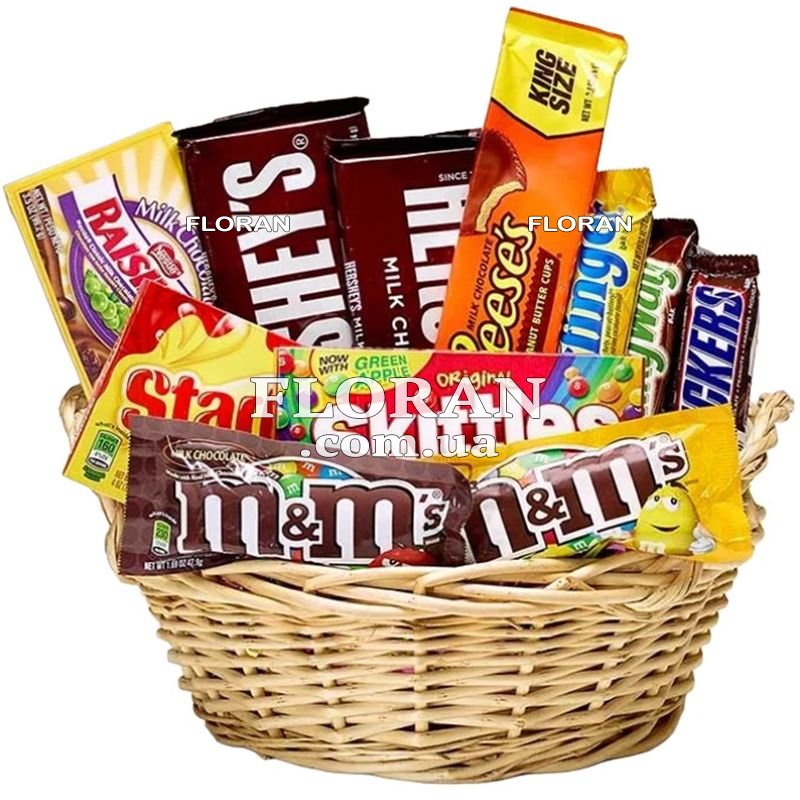 драже M&M's или Skittles 60-90 г – 4 шт., плитка шоколада – 4 шт., вафли 1 упаковка, шоколадные батончики – 5 шт., печенье упаковка – 3 шт., рулет бисквитный 170-180 г