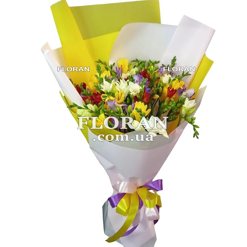 Яркий букет фрезий - код товара FL-1597 - это настоящая вспышка красок и энергии. В этом букете собрано 41 разноцветная фрезия, которая привнесет радость и свежесть в любое помещение. Каждая фрезия в этом букете обладает ярким и насыщенным цветом, открывая бесконечные возможности для создания ярких и запоминающихся композиций. Разнообразие оттенков позволяет подобрать идеальную комбинацию цветов, чтобы выразить свои эмоции и чувства. Фрезии являются символом энергии, оптимизма и жизненной силы. Они привносят в окружающую обстановку яркость и живость, поднимают настроение и создают атмосферу праздника. Букет фрезий - это прекрасный способ выразить свою радость и восторг, подарить долю света и цвета близкому человеку. Букет упакован с заботой, чтобы каждый цветок сохранял свою свежесть и красоту. Упаковка придает букету завершенный вид и делает его удобным для транспортировки и подарка. Яркий букет фрезий - это прекрасный подарок на любой праздник или особый случай. Он будет олицетворять вашу любовь, восхищение и благодарность. Подарите этот букет кому-то особенному и увидьте, как его глаза засияют от радости и восхищения. Дарите яркие эмоции и цвета вместе с этим прекрасным букетом фрезий. Позвольте им внести в вашу жизнь красоту и радость, которые они несут с собой. Насладитесь взрывом красок и аромата, который подарит вам этот яркий букет фрезий.