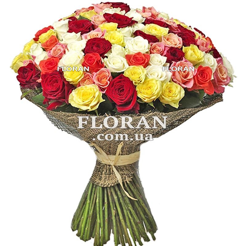 101 різнокольорова троянда - код товару FL-145. Букет 101 різнобарвної троянди - це чудовий спосіб висловити свої почуття та емоції. Він яскравий, барвистий і неймовірно красивий. У ньому поєднуються троянди різних відтінків - від ніжного рожевого до яскраво-червоного і сонячно-жовтого.