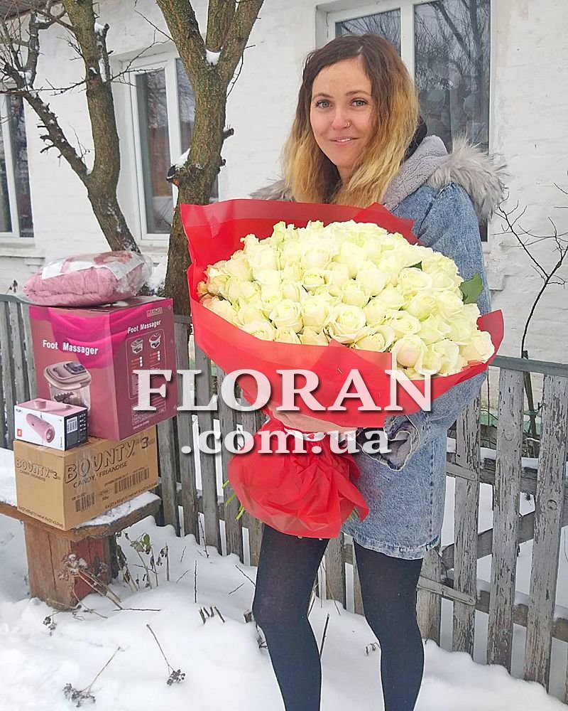 101 троянда біла - код товару FL-139. Не соромтеся вибирати троянди в якості подарунка, навіть якщо здається, що це банально. Ця квітка чудова своєю різноманітністю: за всю історію людства було виведено сотні сортів троянд. Це підтверджує, що досконалість не має меж. Один із прекрасних сортів - Avalanch, який зачаровує своєю милою красою. Рослина середнього розміру підходить для багатьох випадків. Білий колір асоціюється з чистотою, світлом і невинністю, роблячи його ідеальним варіантом для подарунка нареченій.