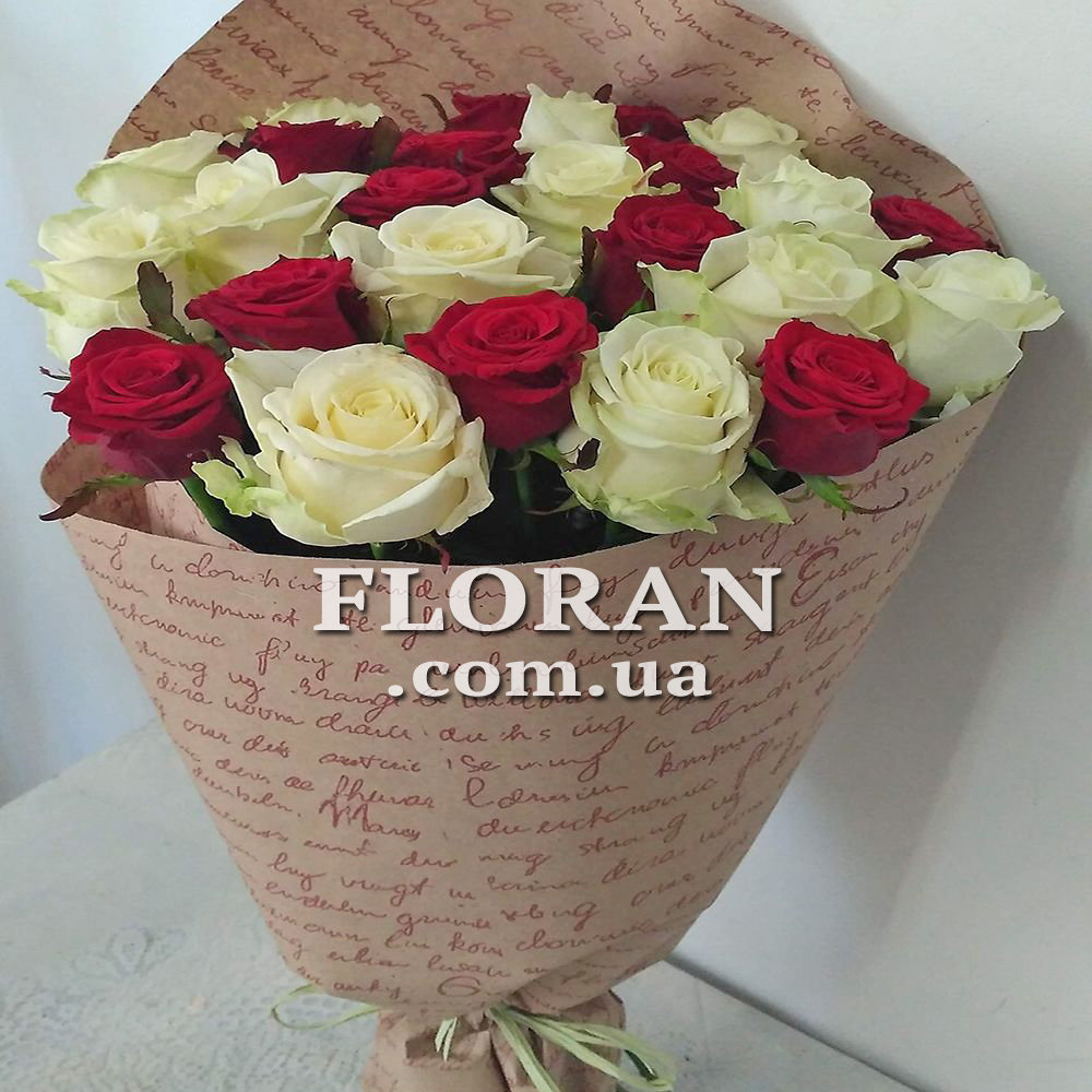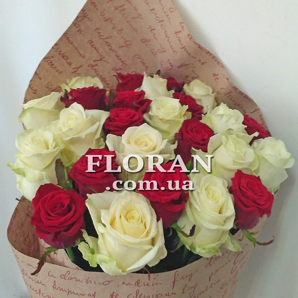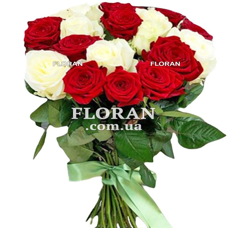 25 червоно білих троянд - код товару FL-56. Букет із троянд - це завжди прекрасний подарунок, який підійде для будь-якого випадку. Але якщо ви хочете порадувати свою другу половинку або близьку людину, то букет з 25 червоних і білих троянд стане справжньою окрасою свята. Ці троянди - справжній витвір мистецтва, створений з українських троянд. Червоного і білого кольору троянди гармонійно поєднуються одна з одною, створюючи неповторний образ. Букет троянд - це завжди символ любові і ніжності, який здатний передати найтепліші почуття. Подаруйте цей букет своїй коханій і вона обов'язково оцінить вашу турботу і увагу.