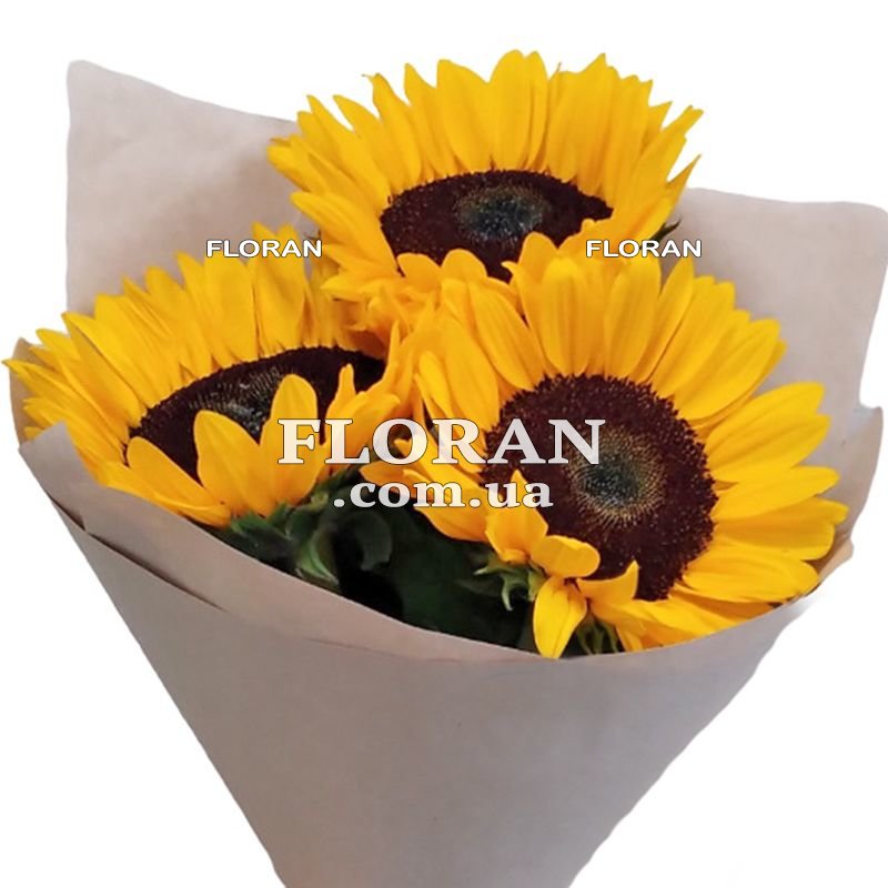 3 соняшники - код товару FL-457. Маленький букет із трьох соняшників – це чудовий варіант для того, щоб подарувати своїм близьким, друзям чи колегам невеликий, але дуже символічний подарунок. Ця квітка символізує світло, тепло, доброту і радість, тому букетик із трьох соняшників стане чудовим подарунком для того, щоб висловити свою подяку, повагу, любов чи просто побажати гарного дня.