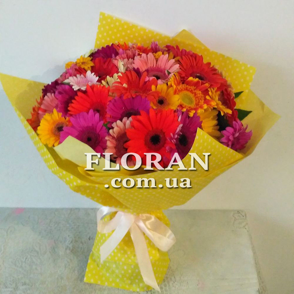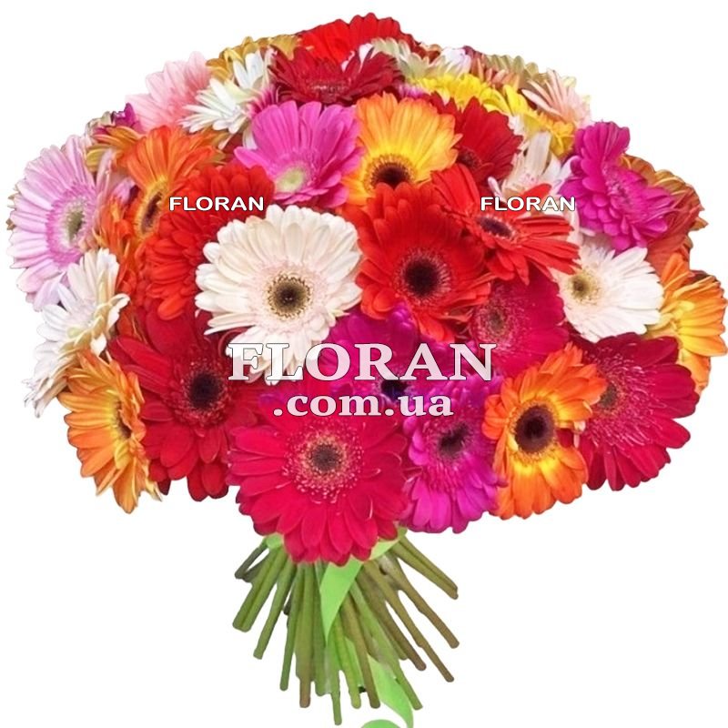 51 гербер - код товару FL-373. Букет із 51 гербери – це справжній квітковий феєрверк, який не залишить байдужим нікого. Цей гарний букет яскравий та різнокольоровий, що складається з гербер різних відтінків – від насичених фарб до ніжних пастельних тонів. Велика кількість кольорів створює відчуття щедрості та щедрого дару, який змусить серця одержувачів завмирати від захоплення. Гербери - це символ радості, оптимізму та веселощів, і такий букет стане чудовим подарунком для будь-якого свята або просто щоб подарувати гарний настрій. Кожна квітка чудово виглядає в цій композиції, і разом вони створюють незабутній ефект, який порадує око та подарує незабутні враження.
