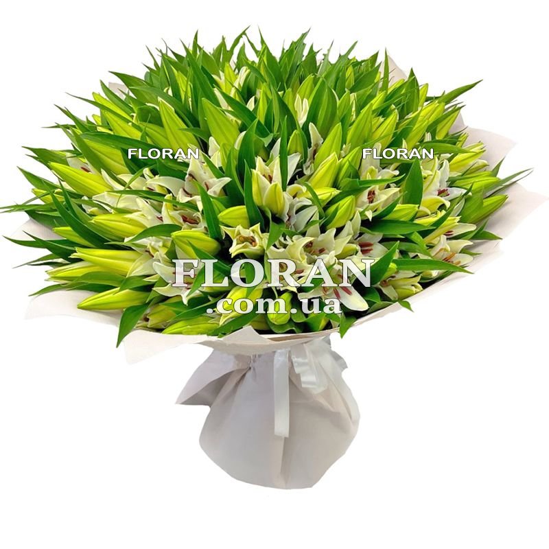 55 лілій - код товару FL-349. Великий букет білих лілій здатний викликати здивування та захоплення у будь-якої людини. Білі лілії символізують чистоту душі та думок, а також є виявом вишуканості та елегантності.