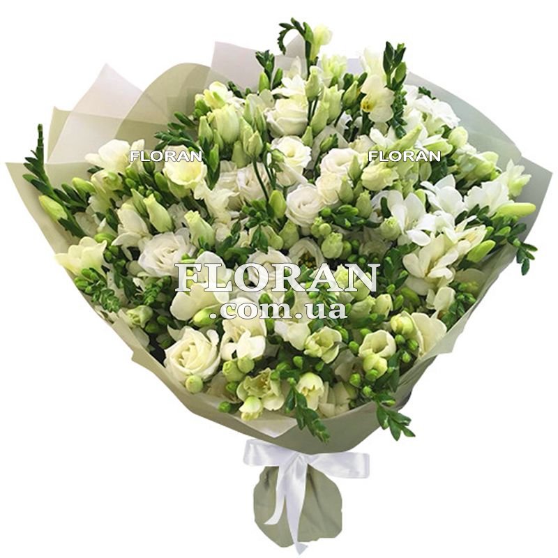 Ароматний букет - код товару FL-1083. Букет складатиметься з 25 білих фрезій і 14 білих еустом. Він буде оформлений в упаковку. Білі фрезії - це прекрасні квіти з ніжним ароматом, що наповнює повітря свіжістю та приємним запахом. Вони мають безліч маленьких квіточок на кожному стеблі та чудово поєднуються з іншими квітами. Білі еустоми додадуть вишуканості та делікатності в букет. Ці квіти мають маленькі квіточки, зібрані в щільні суцвіття, і мають приємний солодкий аромат. Цей ароматний букет буде не тільки красивим подарунком, а й чудово наповнить приміщення своїм вишуканим ароматом. Він підійде для різних особливих випадків і стане чудовим презентом для вашої особливої та коханої людини.