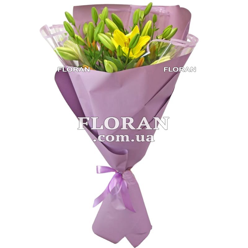 Азіатська лілія в букеті - код товару FL-1037. Букет з азіатськими ліліями являє собою чудове поєднання фарб і ароматів. У цьому букеті присутні 7 яскравих жовтих і помаранчевих азіатських лілій, які створюють яскраве і привабливе поєднання кольорів.
