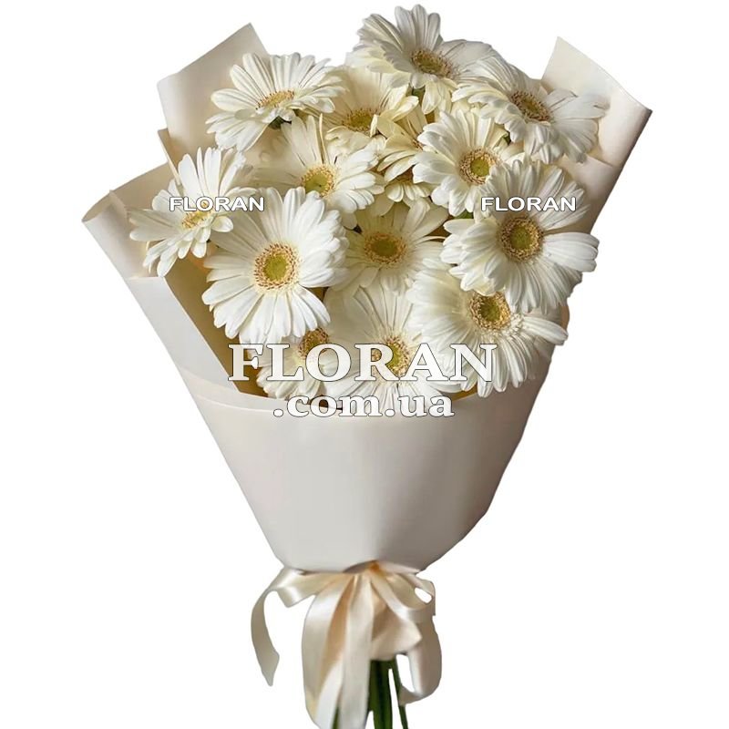 Білі гербери – код товару FL-1558 – це чудовий вибір для привітання жінки з народженням дитини або для привітання нареченої у день весілля. Білий колір гербер символізує чистоту, ніжність і свіжість. Він чудово підходить для особливих моментів, наповнених радістю та хвилюванням. Букет із 15 білих гербер в упаковці буде передавати особливу елегантність та витонченість. Привітання жінки з народженням дитини букетом білих герберів висловить ваше захоплення та радість за нове життя, яке починається. Гербери приносять світло та радість, уособлюючи чистоту та надію. Цей букет стане символом прекрасного початку та дасть змогу поділитися важливим моментом із молодою мамою. Також білі гербери ідеально підходять для вітання нареченої у день весілля. Вони символізують чистоту та ніжність кохання, а їхня свіжість та краса створять атмосферу романтики та подяки. Білі гербери допоможуть висловити ваші найщиріші побажання щастя та любові нареченій цього особливого дня. Не забувайте, що упаковка букета додасть особливого шарму і захистить квіти під час доставки. Ми можемо доставити букет з білими герберами в будь-яке місто, щоб ви змогли порадувати своїх близьких та дорогих людей. Надішліть цей прекрасний букет прямо до них, щоб поділитися своїми найкращими побажаннями та дарувати радість. Білі гербери в букеті - це знак уваги та любові, який захоплюватиме і радуватиме отримувача протягом тривалого часу. Привітайте своїх близьких із цими прекрасними квітами та подаруйте їм незабутні моменти радості та щастя.