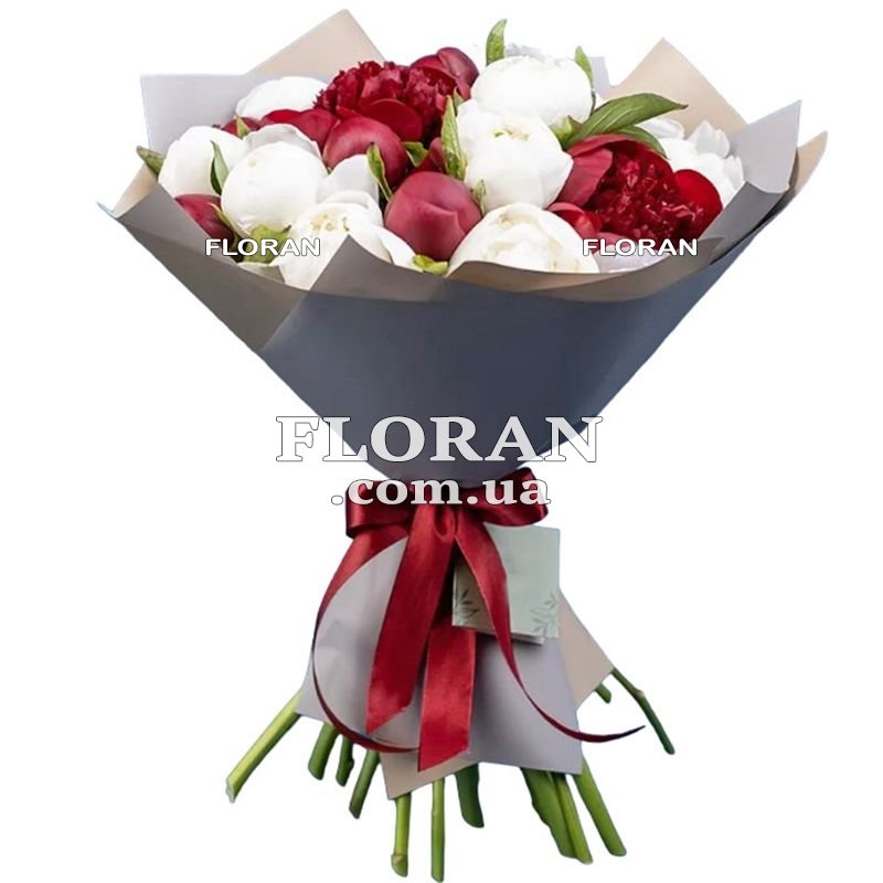 Білі та бордові півонії - код товару FL-3054. Вишуканий букет з 25 білих і бордових імпортних півоній стане ідеальним подарунком для особливого випадку або просто щоб порадувати близьких своєю красою. Білі півонії символізують чистоту і ніжність, розпускаючи свої пишні квіти немов зірки в небі. А бордові додадуть композиції вишуканості та глибини, створюючи атмосферу загадковості та романтики. Замовляючи у нас букет з білими і бордовими півоніями, ви можете бути впевнені в якості та свіжості квітів. Ми пропонуємо зручну доставку, яка дає змогу зробити сюрприз анонімним або потішити близьких, які перебувають в іншому місті або країні. Кожна квітка доставляється з турботою, щоб дарувати радість і захоплення. Даруйте цей чарівний букет своїм близьким - мамі, дружині, подрузі або колезі, і ви побачите, як їхні обличчя світяться посмішками і очі наповнюються вдячністю. Ці квіти несуть у собі не тільки красу, а й тепло ваших почуттів, створюючи неповторну атмосферу любові й умиротворення.