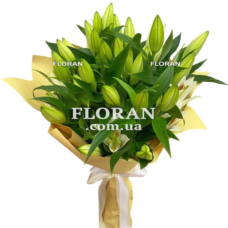Ми з гордістю доставимо цей букет з 9 білих лілій у будь-яке місто, щоб ваше послання любові та поваги було почуте та відчутно. Дозвольте цим ліліям перенести ваші найтепліші та найщиріші побажання, а їх витонченість та краса відобразити незабутні моменти в житті вашого одержувача. Зробіть день особливим за допомогою цього букета із 9 білих лілій. Він стане ідеальним доповненням до будь-якого інтер'єру та чудовим способом висловити свої почуття та увагу. Подаруйте частинку ніжності та елегантності за допомогою цих чудових лілій.