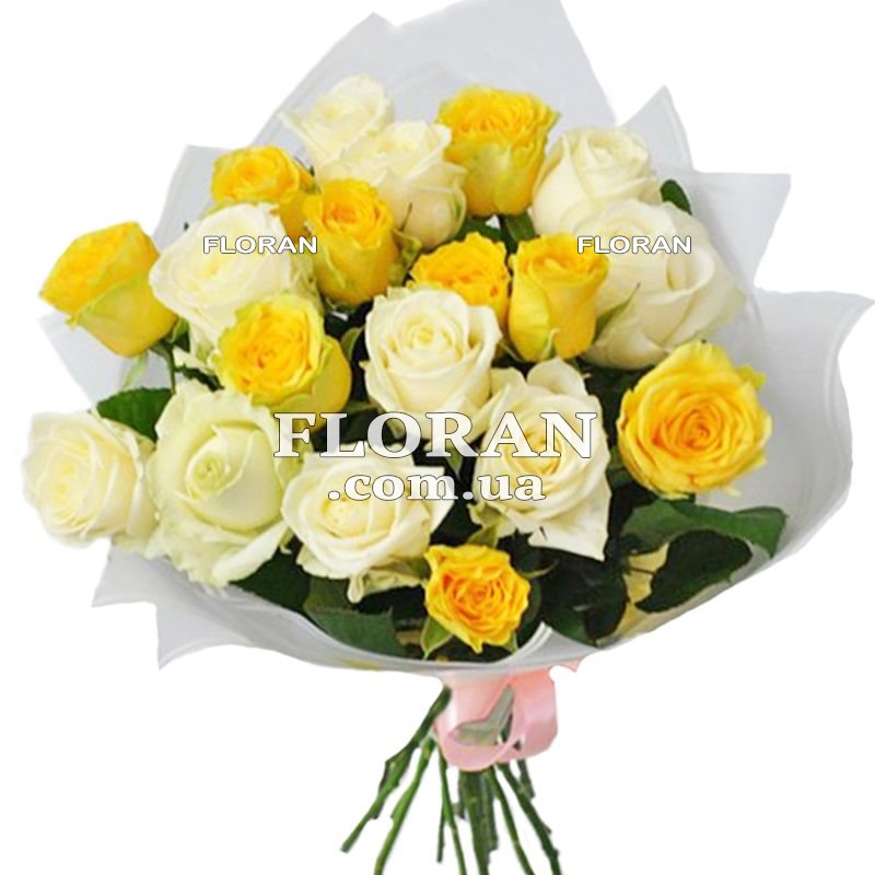 Букет білих жовтих троянд - код товару FL-2616. Букет, що складається з білих і жовтих троянд, є дивовижним поєднанням квітів, яке втілює в собі яскравість і чистоту білих троянд і сонячне тепло жовтих троянд. Це комбінація, яка може мати різні символічні значення та підходить для різних випадків. Білі троянди, як правило, символізують чистоту, невинність та новий початок. Вони часто подарують на весіллях, де уособлюють чистоту намірів та обіцянку вічного кохання. Жовті троянди, у свою чергу, асоціюються з радістю, сонцем та дружбою. Вони можуть висловлювати вашу подяку та радість спілкування. Такий букет ідеально підійде як подарунок друзям або близьким, щоб висловити свою радість від їхньої присутності у вашому житті. Він також може бути символом нового початку, що робить його придатним для поздоровлень із днями народження, випусками та іншими радісними подіями. Наш магазин пропонує професійну доставку букета у зручний для вас місце та час. Ми гарантуємо свіжість та якість кольорів, а також дбайливо оформлену упаковку. Незалежно від того, де знаходиться одержувач, ми доставимо ваш подарунок, щоб подарувати їм радість та тепло в цій особливий момент.