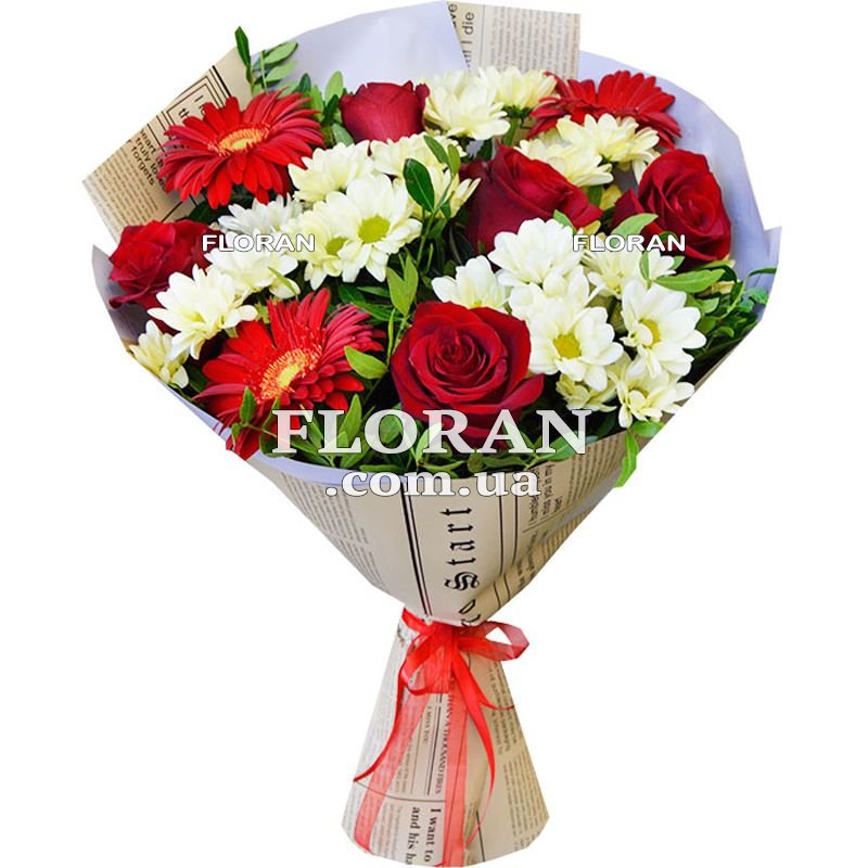 3 червоні гербери, 5 червоних троянд, 5 білих хризантем, зелень, упаковка
