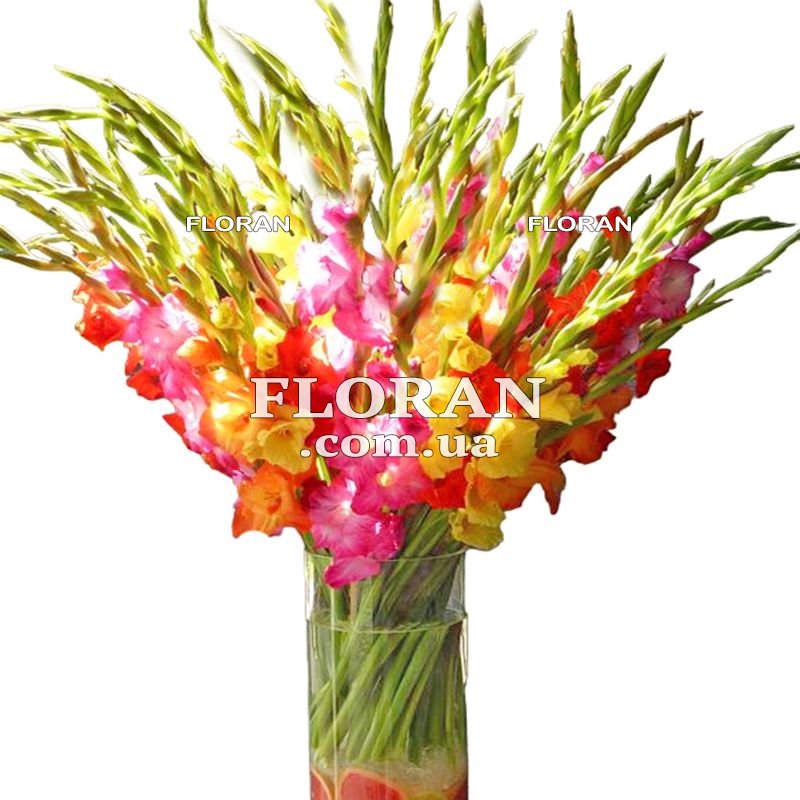 Букет гладіолусів Ювілей - код товару FL-1875. Букет гладіолусів на Ювілей - це чудовий урочистий вияв уваги та привітання з особливим днем. У цій вражаючій композиції зібрано 65 різнокольорових гладіолусів, які символізують красу, радість та різноманітність життя. Кожен гладіолус у цьому букеті яскравий та унікальний, і разом вони створюють вражаюче видовище. Різноманітність кольорів від яскравого червоного до ніжного рожевого, від сонячного жовтого до витонченого фіолетового, дозволять подарувати не лише гарний, але й символічний букет, який запам'ятається імениннику на довгі роки. Цей букет гладіолусів стане чудовим подарунком для ювіляра, адже гладіолуси вважаються символами урочистості, перемоги та здобутків. Вони символізуватимуть багате життя, сміливість, стійкість та шляхетність іменинника, а також принесуть красу та радість на святковий стіл. Упаковка букета також заслуговує на особливу увагу, вона буде оформлена з витонченістю та акуратністю, щоб підкреслити важливість моменту та додати блиск святу. Якщо ви хочете привітати іменинника з ювілеєм, але знаходитесь далеко, не турбуйтесь! Наша служба доставки готова допомогти вам з доставкою цього чудового букета гладіолусів у будь-яке місто України. Надійний кур'єр доставить букет вчасно та з теплими побажаннями, щоб ваш вітальний жест був справді особливим та незабутнім.