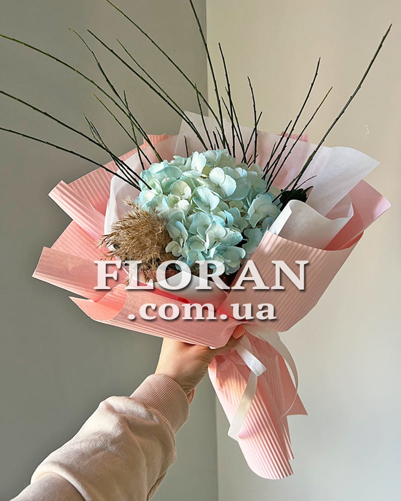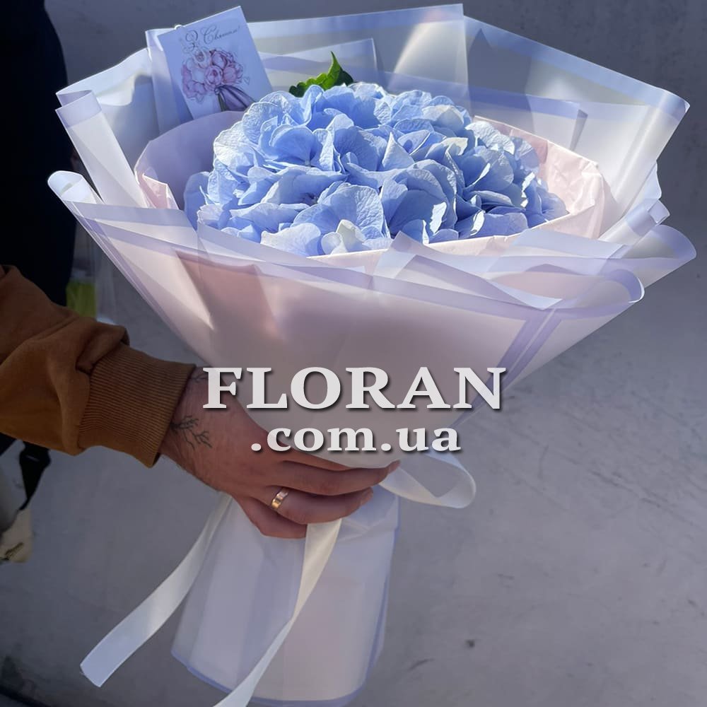 Букет із 1 гортензії - код товару FL-1523. Букет з однієї синьої гортензії – це ніжний та витончений подарунок, який приверне увагу своєю простотою та красою. Синій колір гортензії символізує мир, гармонію та спокій, а також виражає щирі почуття та відданість. Такий букет підійде для різних особливих випадків, від романтичних побачень до днів народження або просто для того, щоб порадувати близьку людину. Він уособлюватиме вашу ніжність і турботу, показуючи, що навіть одна квітка може бути достатньою для передачі глибоких почуттів. Синя гортензія в цьому букеті буде яскравим акцентом, що привертає увагу і додає унікальності композиції. Ця квітка відрізняється своєю великою і пишною формою, створюючи чудове враження. Незалежно від того, кому ви призначаєте цей букет – коханій людині, родичу чи другу – він точно викличе радість та посмішку на обличчі одержувача. Навіть одна гортензія здатна передати вашу турботу та увагу, а також створити атмосферу тепла та затишку. Ми гарантуємо, що цей букет буде оформлений професійно і доставлений у безпеці, щоб зробити максимальне задоволення одержувачу. Дозвольте нам допомогти вам створити особливий момент та подарувати радість за допомогою цього прекрасного букета з однієї синьої гортензії.