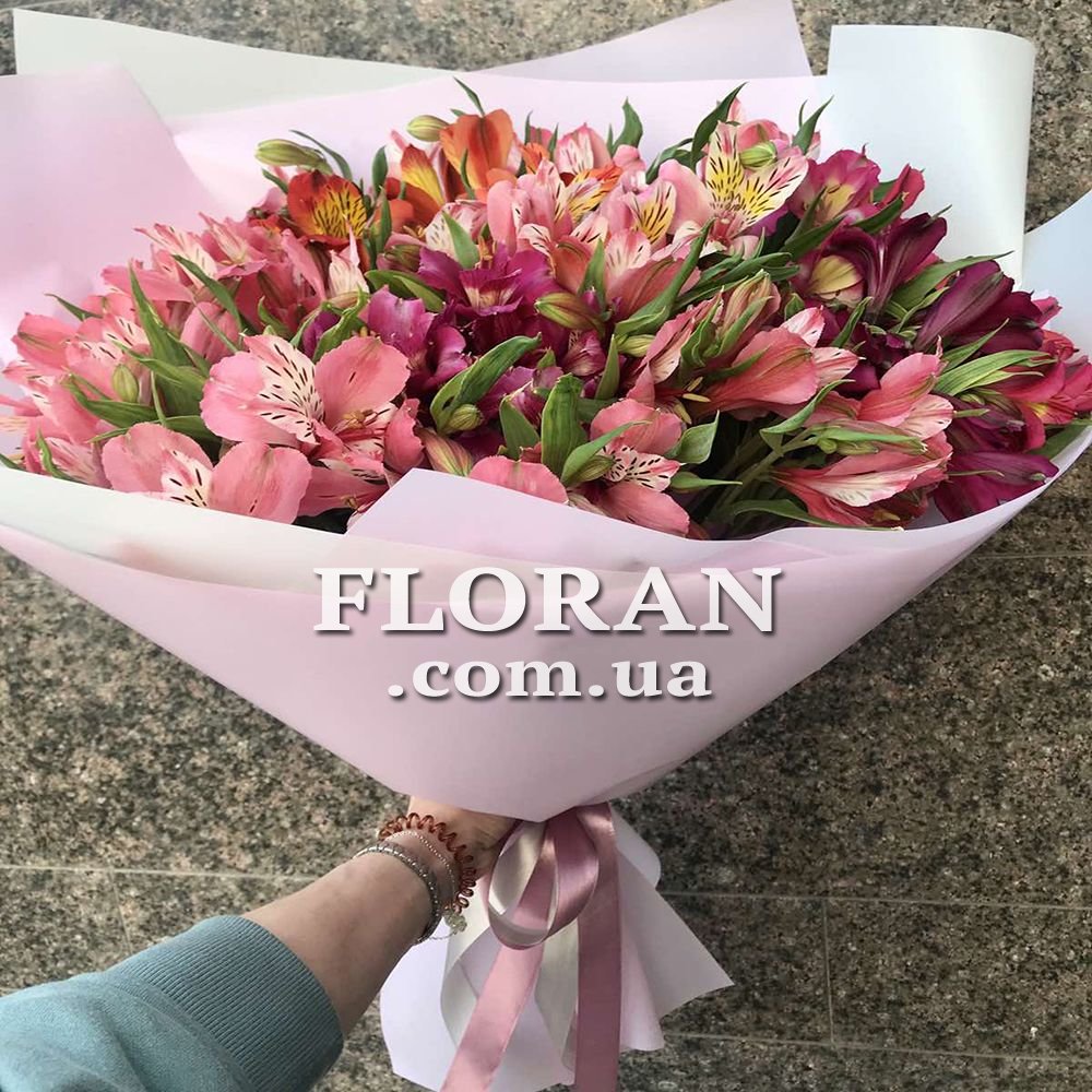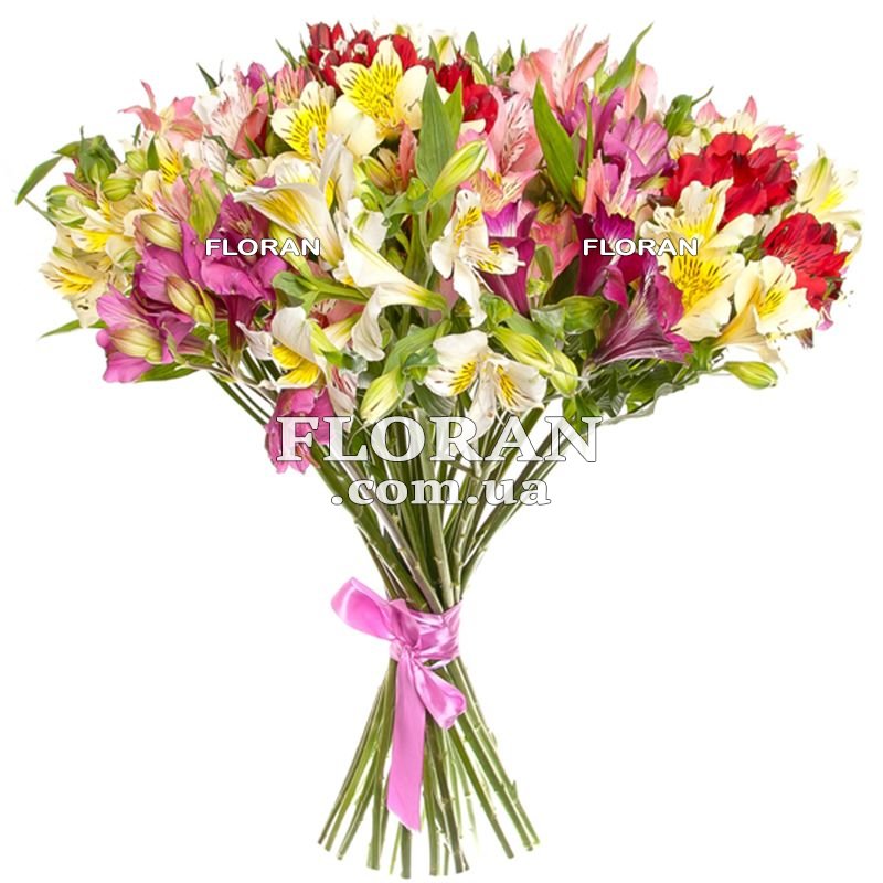 Букет із 25 альстромерій - код товару FL-299. Яскравий букет з 25 альстромерій - це справжня радість і свято! Завдяки різноманітності відтінків і яскравим кольорам, цей букет виглядає дуже пишно і весело. У ньому поєднуються різні відтінки - від яскраво-червоних і помаранчевих до ніжних рожевих і лавандових. Кожна квітка має неймовірно красивий і свіжий вигляд, що підкреслює життєрадісність цього букета.