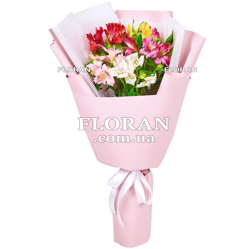 Букет із 5 альстромерій - код товару FL-822. Маленький букет з п'яти альстромерій - це ідеальний спосіб показати комусь свою турботу і увагу. Такий букет відмінно підійде в якості невеликого подарунка або сувеніра. Маленькі діти обожнюють квіти, і цей букет стане для них особливим подарунком. Водночас, він може бути використаний і як знак уваги для колеги, друга або близької людини. Красиво оформлений букет альстромерій стане приємним сюрпризом для будь-якого одержувача, незалежно від віку і статі.
