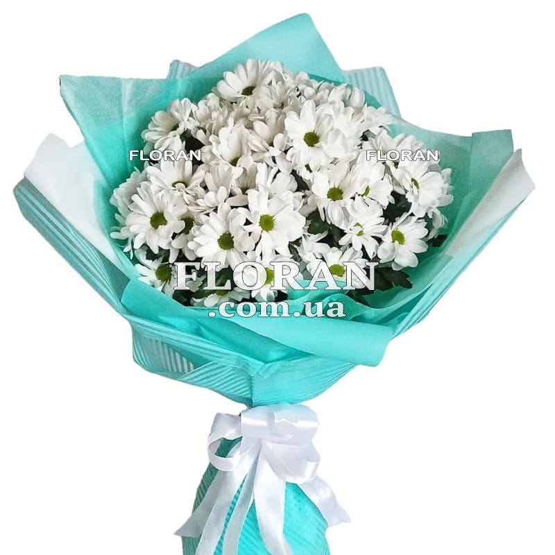 Букет із білих ромашкових хризантем - код товару FL-841. Букет з білих ромашкових хризантем - це вишукане та чудове поєднання ніжності та простоти. Білі ромашкові хризантеми є символом чистоти, невинності та свіжості, а їхні пишні та округлі квітки створюють елегантний та привабливий образ.
