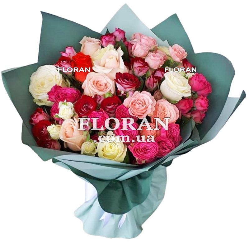 Букет із кущових і звичайних троянд - код товару FL-1377. Букет, що складається з кущових та звичайних троянд, є гармонійним поєднанням краси та вишуканості. У цій композиції чудово поєднуються 9 різнокольорових звичайних троянд та 16 різнокольорових кущових троянд, створюючи яскравий та привабливий образ. Кожна звичайна троянда в цьому букеті виражатиме вашу любов, пристрасть та романтичні почуття. Її вишукана форма та ніжні пелюстки додадуть нотку елегантності та розкоші. Кожна кущова троянда, у свою чергу, надасть композиції об'єму та яскравості. Їхні маленькі, але насичені квіти створять враження достатку та різноманітності. Цей букет із кущових та звичайних троянд буде ідеальним подарунком для будь-якого приводу. Він може бути чудовим символом вашої ніжності та захоплення, а також висловити щирі почуття та глибоку прихильність. Ця комбінація квітів надасть особливого шарму і приверне увагу оточуючих. Комбінований букет з кущових та звичайних троянд стане центральним акцентом будь-якого приміщення та наповнить його ароматом та красою. Він порадує своєю різноманітністю кольорів та дивовижним поєднанням відтінків. Цей букет уособлює гармонію та взаєморозуміння, а також висловлює вашу турботу та увагу до одержувача.