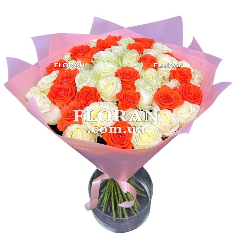 Букет із троянд мікс - код товару FL-2807 - що включає 55 білих та помаранчевих троянд, є справжнім проявом кохання, поваги та ніжних почуттів. Цей букет має незвичайне і вражаюче поєднання кольорів, що робить його універсальним подарунком для різних випадків і різних одержувачів. Білі троянди у колірній гамі символізують чистоту, невинність та щирість почуттів. Помаранчеві троянди приносять із собою почуття радості та енергії, вони символізують дружбу та адмірацію. Цей букет може бути чудовим подарунком для вашої коханої, дружини чи дівчини. Білі троянди говорять про ваше чисте і щире кохання, про те, що воно — ваш світлий і ніжний ангел. Помаранчеві троянди доповнюють цей образ, приносячи у ваше життя радість та позитивні емоції. Такий букет також підходить для моментів, коли потрібно привітати з ювілеєм, днем народження чи іншою важливою подією. Він буде яскравим та пам'ятним подарунком, який висловить ваші найкращі побажання. Ми готові створити цей чудовий букет для вас і доставити його у потрібне місце та час. Ми цінуємо вашу довіру та гарантуємо якість та свіжість кольорів. Наш букет стане яскравим втіленням ваших почуттів та надійним способом висловити ваші емоції.