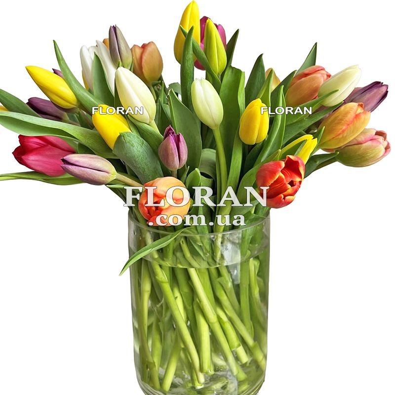 29 різнокольорових тюльпанів, упаковка