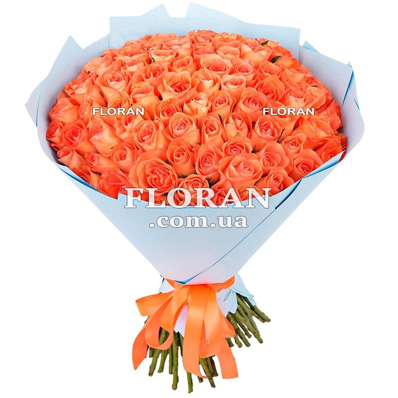 Букет коралового кольору - код товару FL-2599 - це не тільки неймовірно красивий та ефектний подарунок, але й символ величезної пристрасті та захоплення. Кораловий колір троянди поєднує в собі тепло помаранчевого та ніжність рожевого, створюючи дивовижну атмосферу тепла та кохання. Такий букет подарує радість та щастя коханій жінці, подрузі чи навіть матері. Він підходить для найособливіших моментів у житті: весілля, ювілеї, дні народження та інші свята, коли потрібно висловити своє щире кохання та повагу. Букет з 91 коралової троянди є втіленням розкоші та витонченості. Отримувач такого подарунка буде в захваті від його краси та глибини почуттів, які він передає. Наші кур'єри готові організувати доставку цього чудового букета в будь-який зручний для вас день і місце, щоб зробити ваш жест незабутнім.