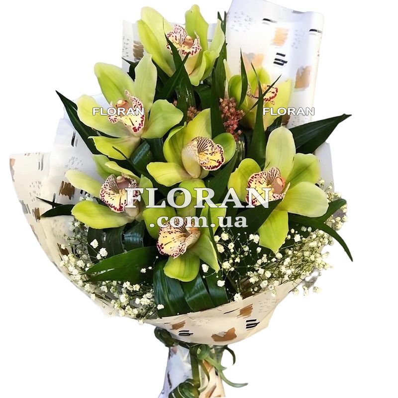 Букет квітів для тата - код товару FL-1639 - з сімома зеленими орхідеями, зеленню, гіпсофілою та упаковкою - це чудовий вибір, щоб привітати та порадувати вашого батька особливим подарунком. Зелені орхідеї символізують життєву енергію, стабільність та благополуччя, їхня присутність у букеті надасть йому свіжості та оригінальності. Гіпсофіла, або повітряна троянда, додасть легкості та ніжності букету. Її дрібні квіточки створять враження ніжної хмаринки навколо орхідей. Зелень доповнить композицію, надаючи їй обсягу та гармонії. Упаковка букета забезпечить його збереження та подання у чудовому вигляді. Ми дбаємо про кожну деталь, щоб ваш букет був доставлений свіжим та красивим. Ви можете замовити цей букет квітів для тата у нашому магазині з доставкою до будь-якого міста України. Ми гарантуємо якість наших кольорів та своєчасну доставку. Подаруйте своєму татові цей особливий букет, який висловить вашу любов, подяку та повагу до нього.