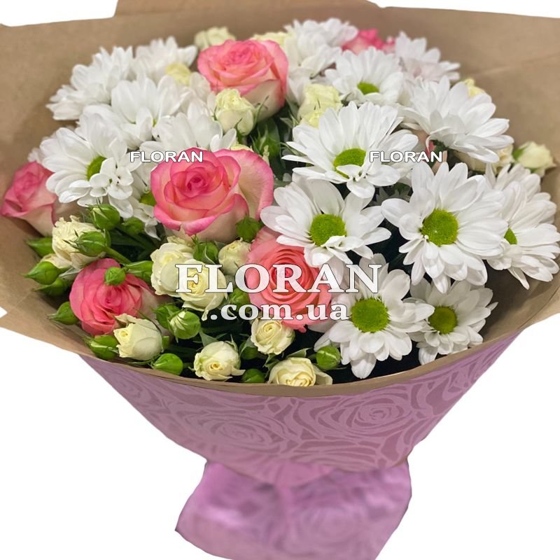 - 3 білі хризантеми: Білі хризантеми символізують щирість, чистоту та довголіття. Вони додадуть букету свіжості та додаткову текстуру.