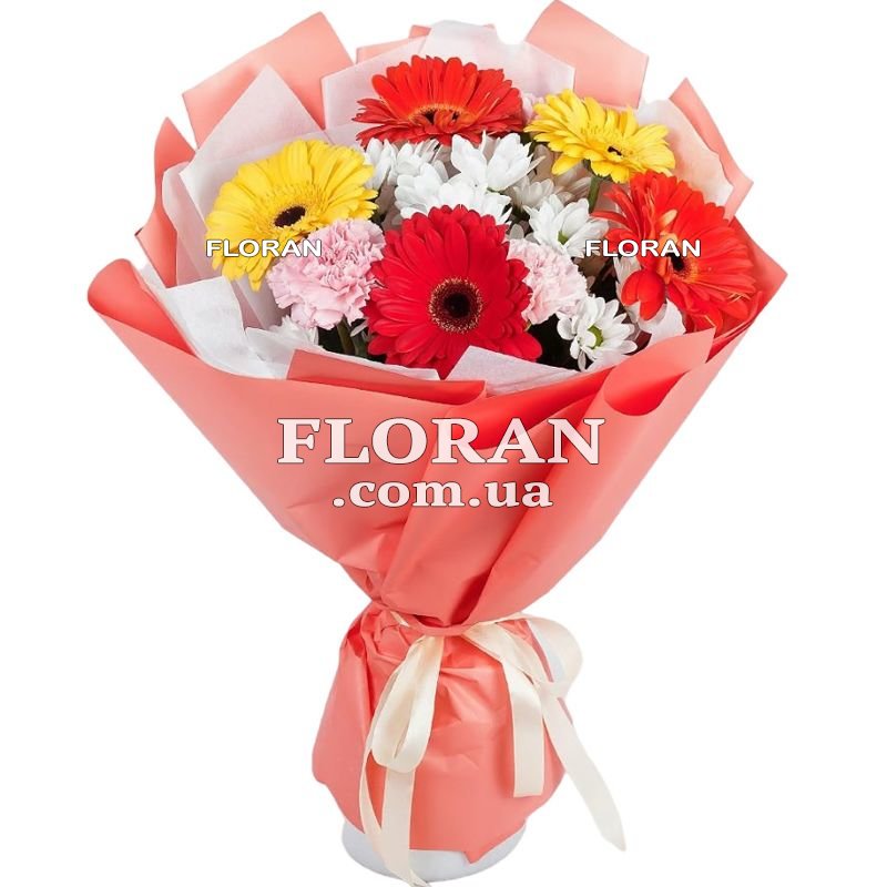 5 червоних і жовтих гербер, 2 гвоздики, 2 білі хризантеми, упаковка