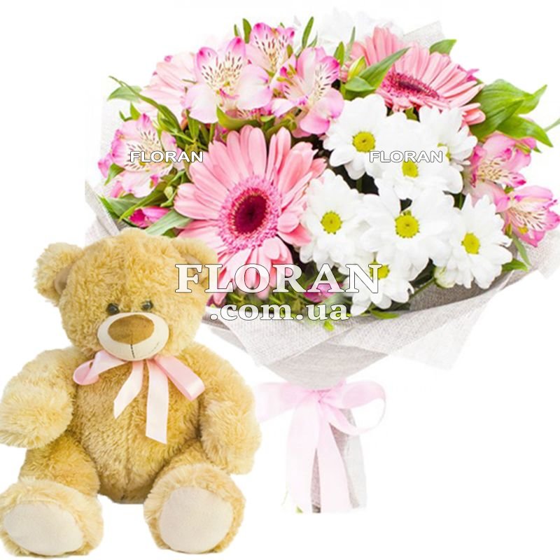 Букет квітів з ведмедиком - код товару FL-543. Цей ніжний букет і ведмедик 30-40 см - ідеальний подарунок для коханої людини. У ньому поєднуються плюшевий ведмедик з квітами та букет з 3 гербер, 3 хризантем та 5 альстромерій. Іграшка та квіти – що може бути краще для створення романтичної атмосфери?