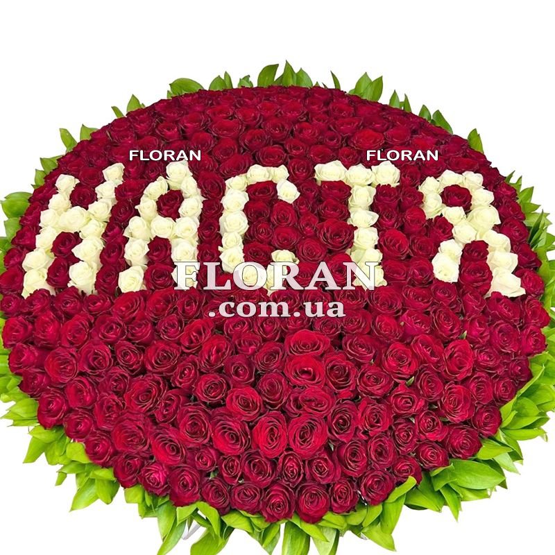 Букет квітів з написом - код товару FL-287. Букет в кошику з червоних троянд з викладеними з білих троянд ім'ям Настя є прекрасним подарунком для вашої коханої. Цей розкішний букет містить аж 301 червону троянду, яка символізує пристрасть і любов. Викладене ім'я Настя з білих троянд додає персональності та індивідуальності цьому прекрасному букету, роблячи його ще більш значущим для вашої особливої дівчини. Букет також представлений в красивому кошику, який додає вишуканості та елегантності цьому чудовому подарунку. Даруйте любов і прекрасні емоції з цим чудовим букетом червоних троянд для вашої Насті.